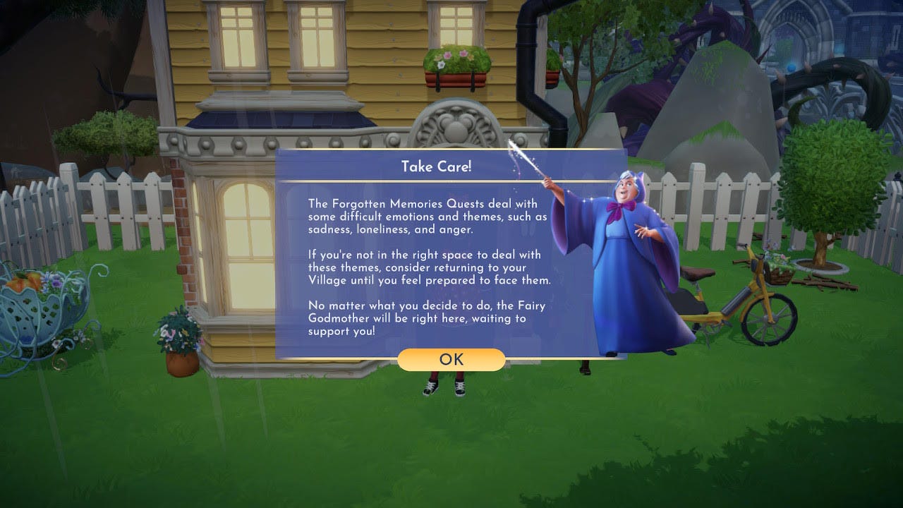 Disney Dreamlight Valley. How random right? I won’t say too much as I don’t want to spoil the game for people who haven’t made it there yet but I do want to mention one part. When the Fairy Godmother was added, she came with a trigger warning. We were told that this particular part of the story had themes of sadness, loneliness, and anger. It told us to “take care”.